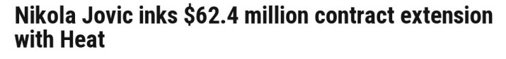 此前热火跟队记者预计约维奇会获得一份4年合同,总价为5000万美元到6000万美元。看起来热火管理层是真的喜欢约维奇,还加钱了。约维奇也有自知之明,没有狮子大开口,选择落袋为安。